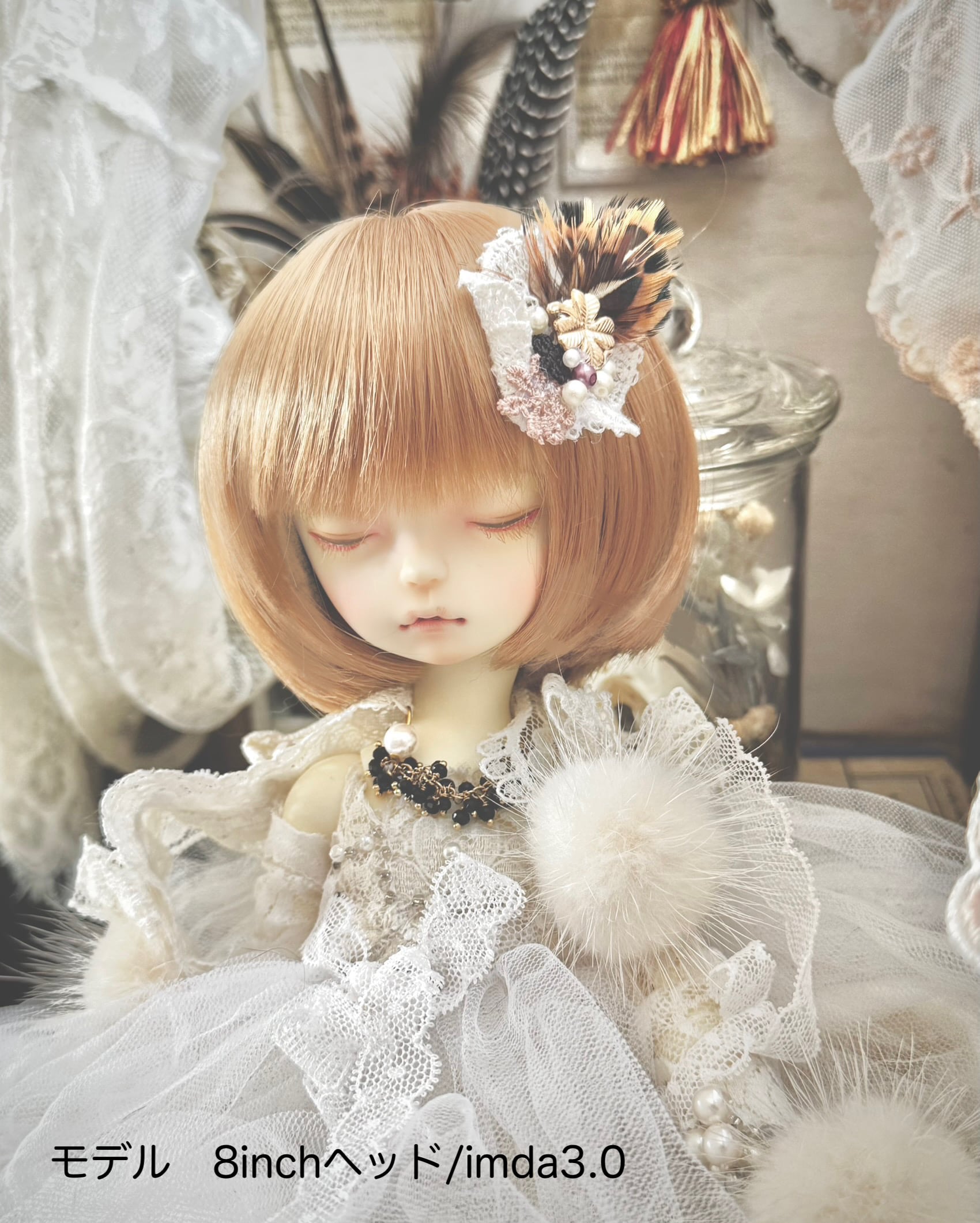着用のモデルさんは、髪飾り使用が8インチヘッドの子で、ブローチ使用が50センチドールの子です。