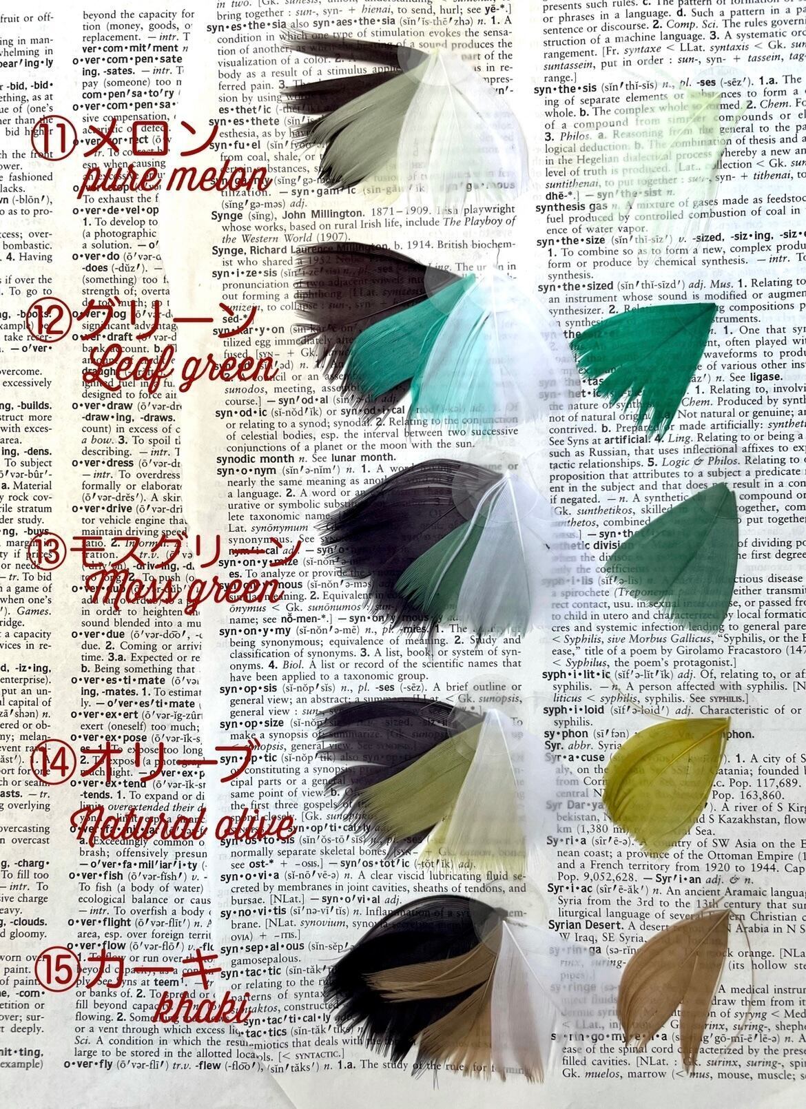 ちなみに、ワンポイントで追加できる特殊な羽根(ふわふわ、柄、長い物、カールしているものなど)の種類は30種類以上ありますので、大体の色の方向性をお伝え頂ければ、こちらのチョイスでおまかせアレンジさせて頂きます。