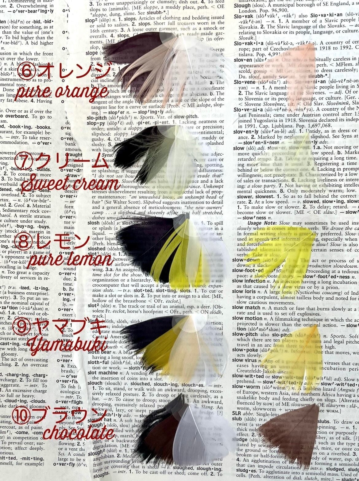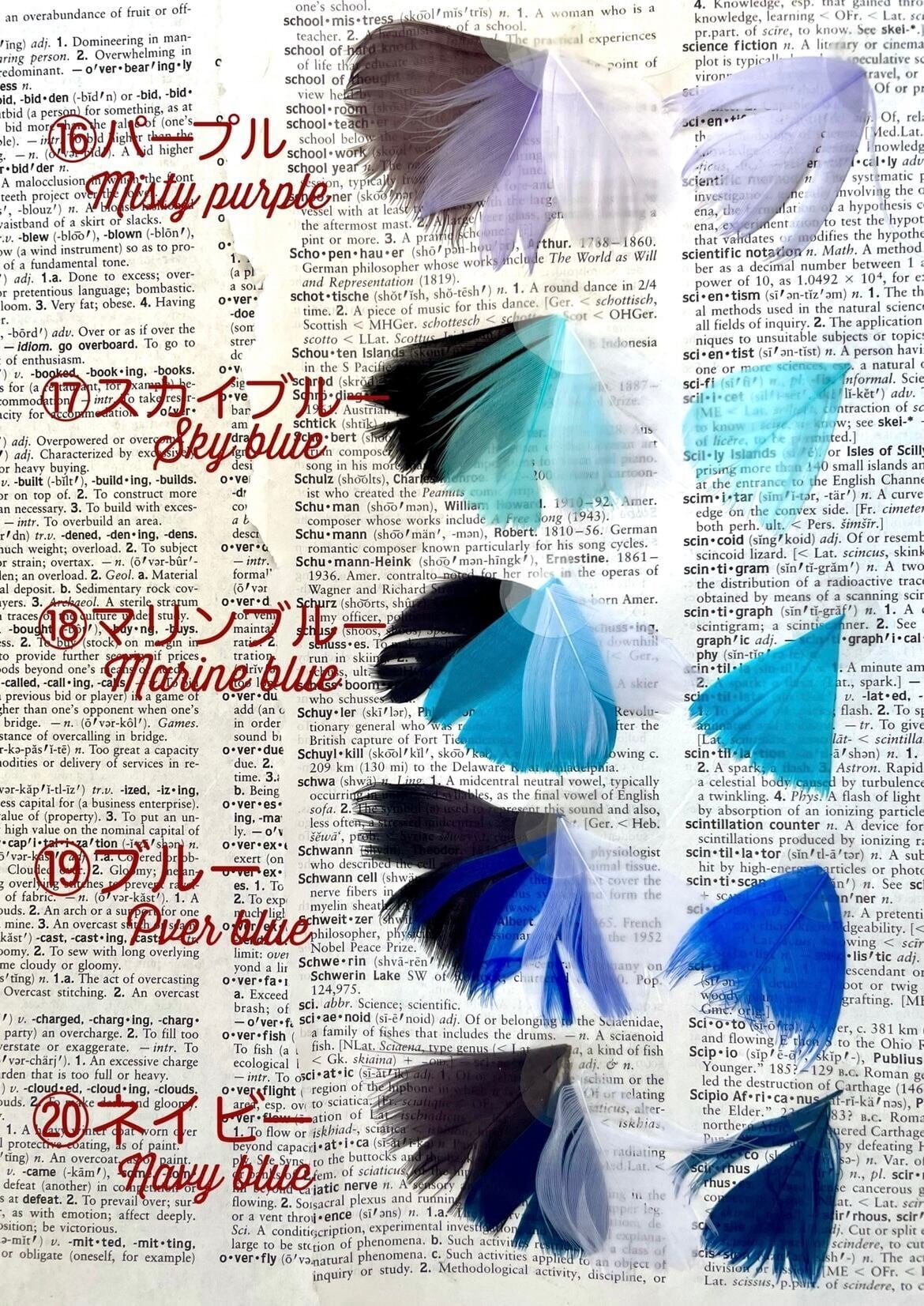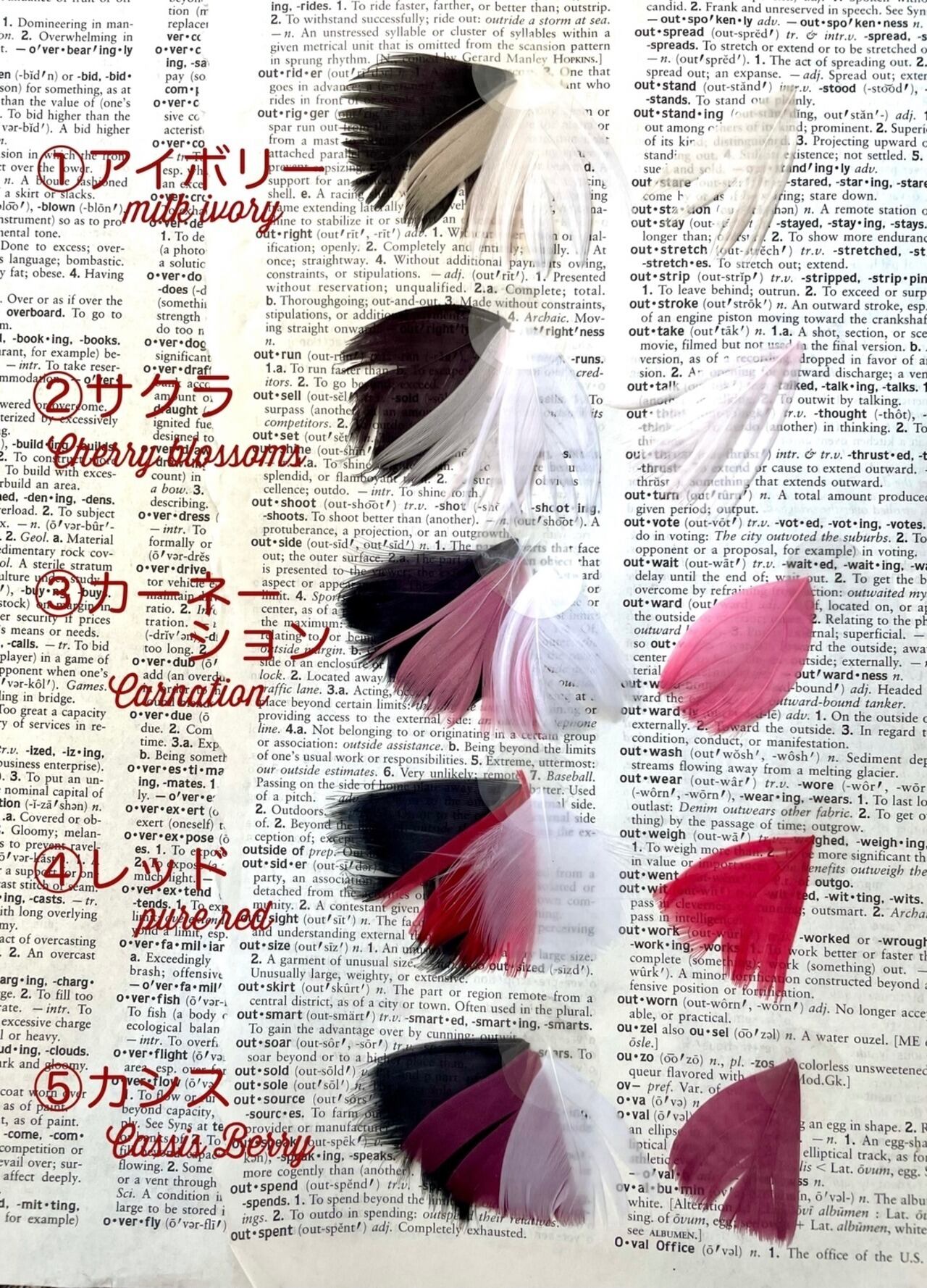 ちなみに、ワンポイントで追加できる特殊な羽根(ふわふわ、柄、長い物、カールしているものなど)の種類は30種類以上ありますので、大体の色の方向性をお伝え頂ければ、こちらのチョイスでおまかせアレンジさせて頂きます。